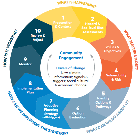 Council is following a 10-step process developed by Ministry for the Environment (MfE) - Figure 1 - which involves the assessment of coastal inundation (flooding from sea water) and coastal erosion hazards. This 10-step process is known as Dynamic Adaptive Planning Pathways (DAPP).